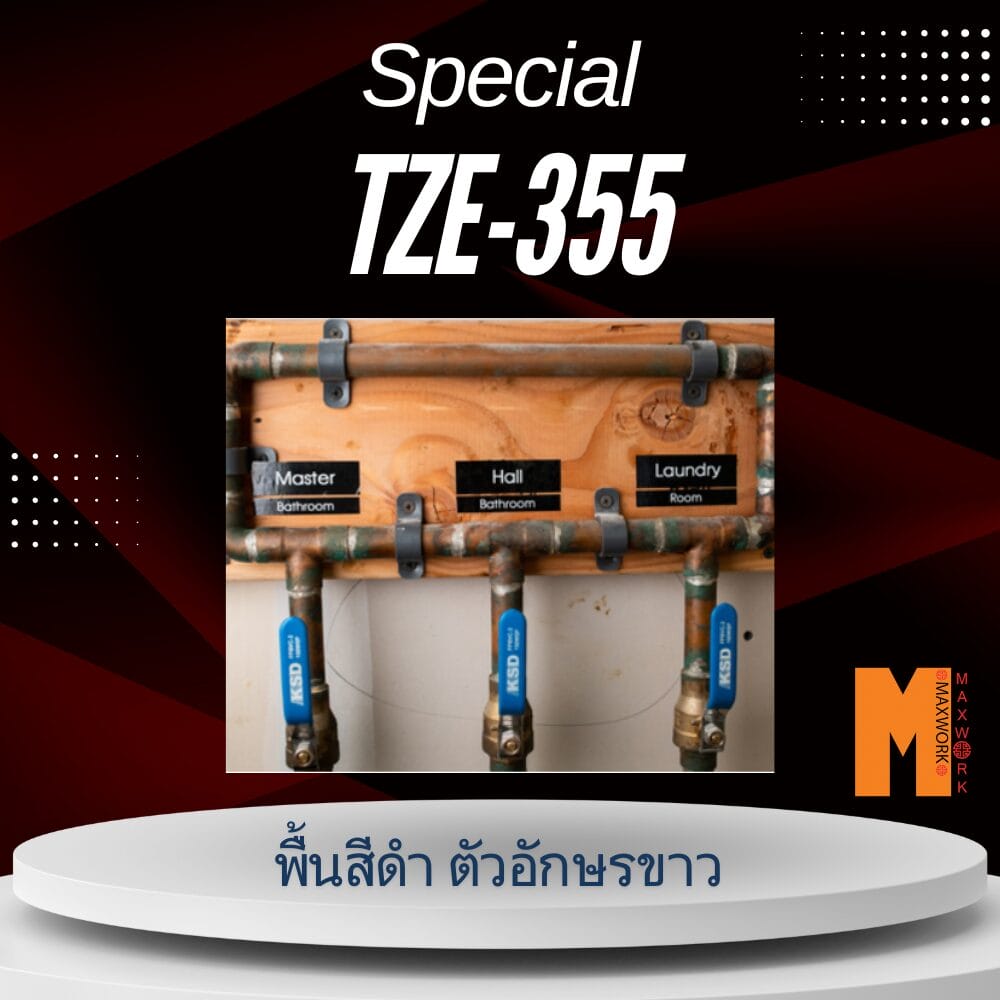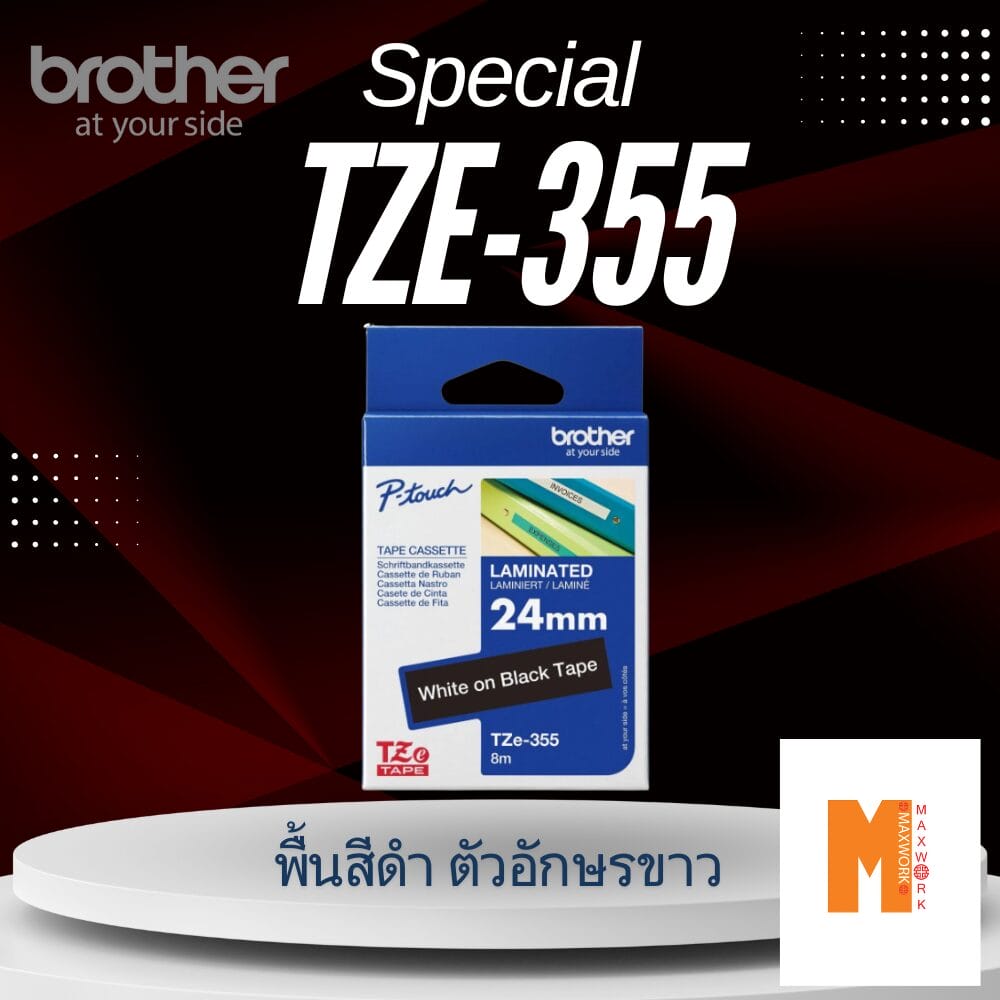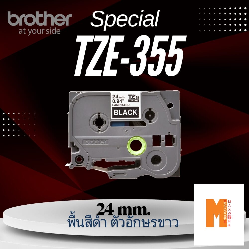 Brother TZE-355 เทปพิมพ์อักษรขนาด 24 มม. ตัวอักษรสีขาว พื้นสีดำ