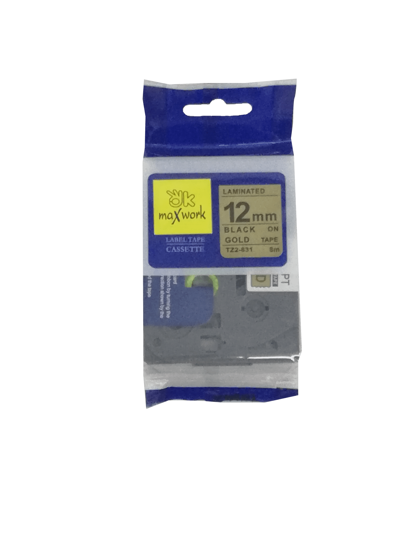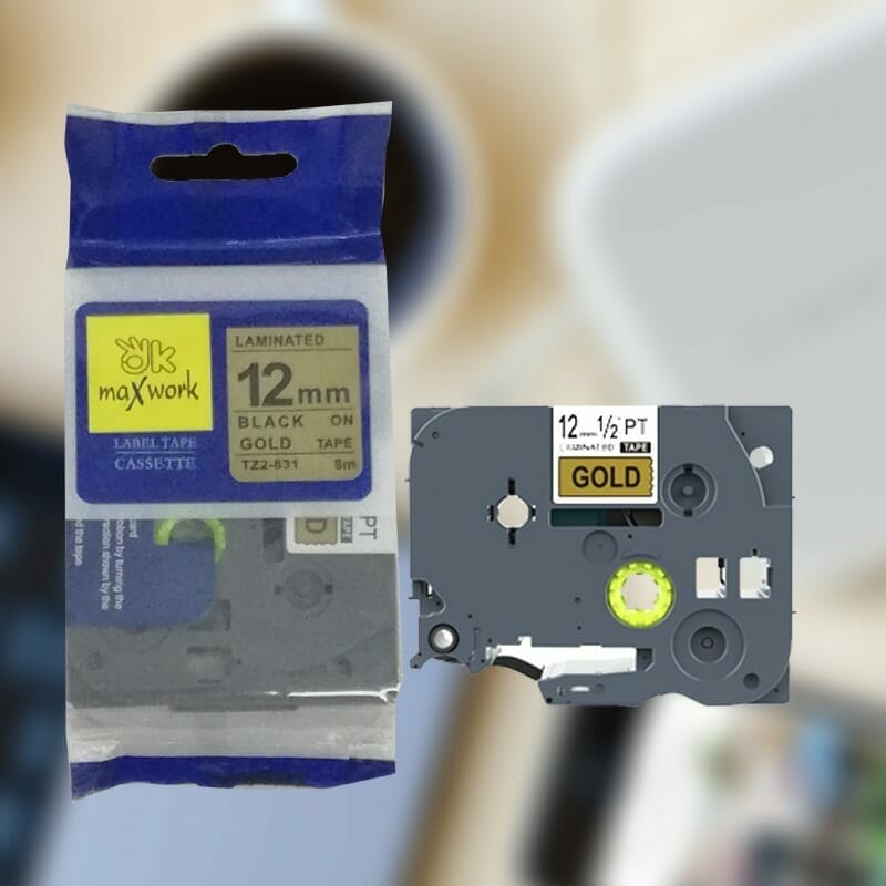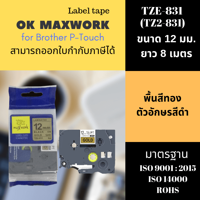 Ok Maxwork เทปพิมพ์อักษร TZE-TZ2-831 ขนาด 12 มิล พื้นทอง-ตัวอักษรสีดำ ยาว 8 เมตร