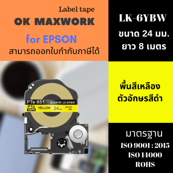 Ok Maxwork เทปพิมพ์อักษรสำหรับเครื่องพิมพ์ Epson LK-6YBP(SC24YW) ขนาด 24 มิล พื้นสีเหลือง ตัวอักษรสีดำ