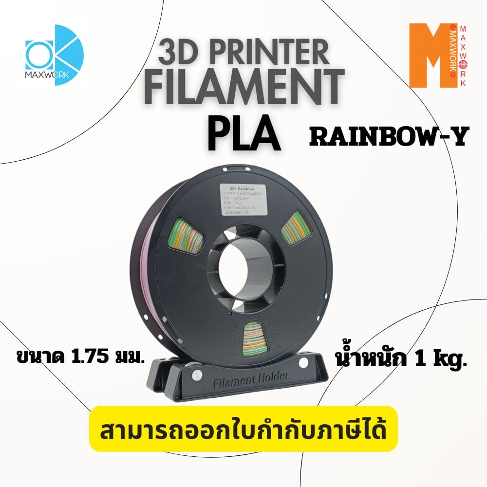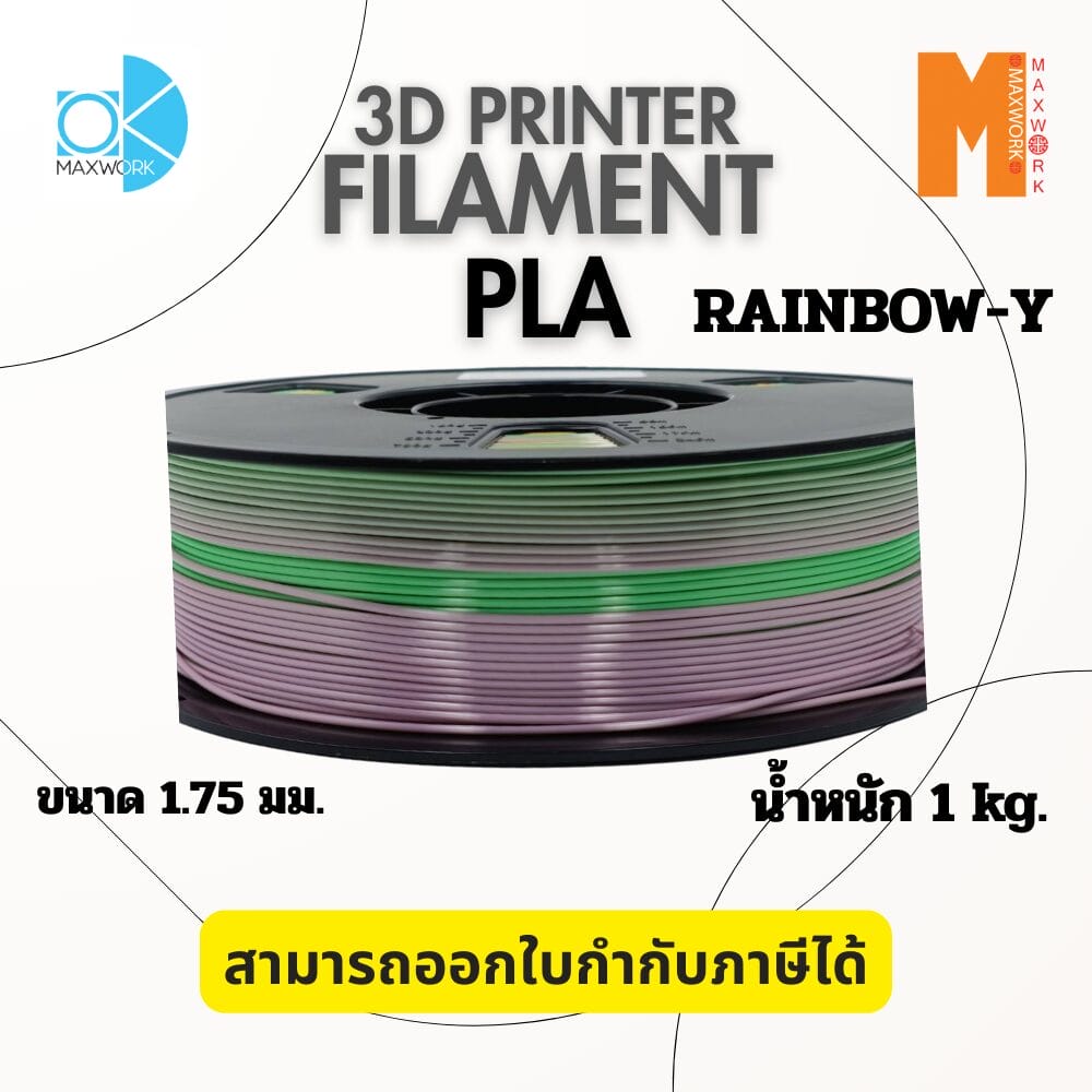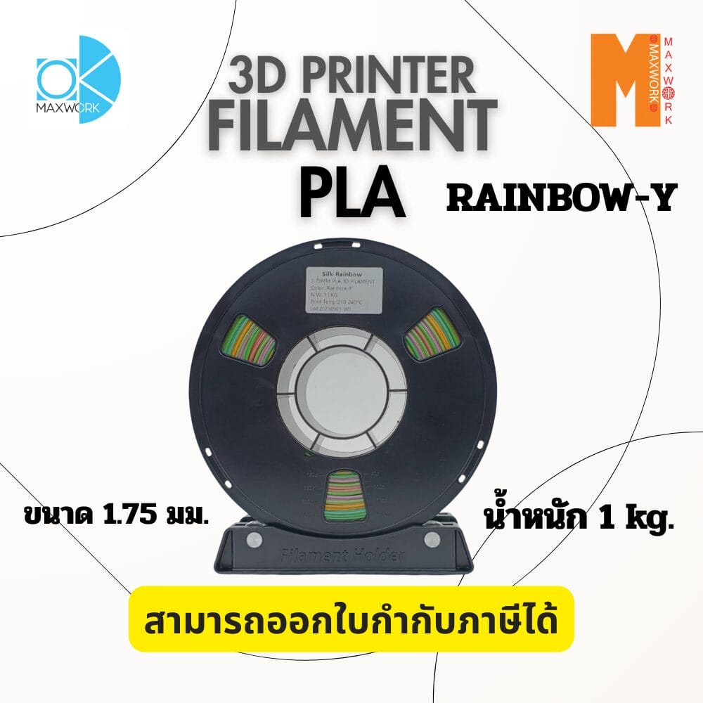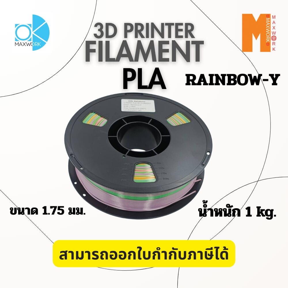Ok Maxwork Filament PLA Rainbow 1.75 มม. 1 กก. คือเส้นใยที่ผสมผสานระหว่าง ความง่ายในการพิมพ์ของ PLA และ ความสวยงามของสีรุ้งแบบ Multicolor เหมาะกับผู้ใช้ทุกระดับที่ต้องการชิ้นงานสวยมีเอกลักษณ์ ไม่ต้องเปลี่ยนสีระหว่างพิมพ์ และให้คุณภาพชิ้นงานที่ดีเยี่ยมทุกครั้ง